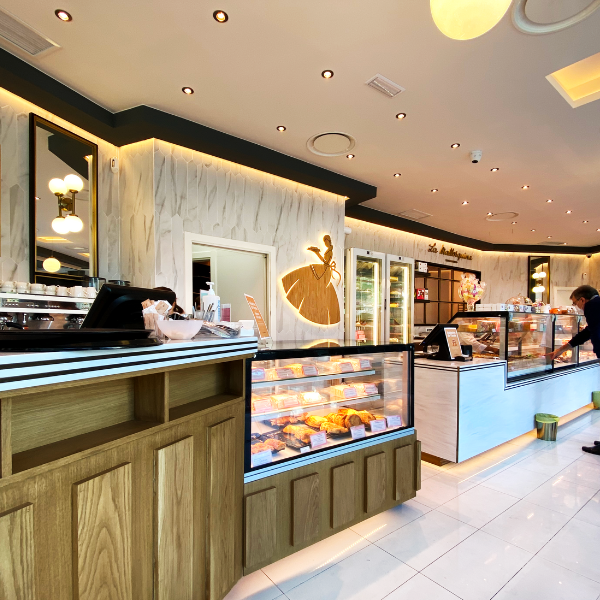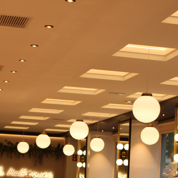 Le concept de la pâtisserie a évolué ces dernières années, à celui-ci s’ajoute désormais celui de la cafétéria, l’utilisateur souhaite consommer des produits pâtissiers fraîchement cuits dans l’établissement même, c’est pourquoi la zone de consommation doit également être éclairée en accord avec le reste de l’établissement pour maintenir l’harmonie et favoriser l’esthétique générale de ce dernier. Il est important de garder cet espace éclairé pour rendre l’expérience client dans l’établissement agréable, mais en le gardant à un niveau secondaire, car l’accent doit toujours être mis sur le produit afin de stimuler les ventes de la pâtisserie.